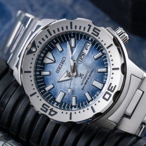 tạo sự khác biệt với mặt số dial được phối màu xanh nhạt mô phỏng bề mặt các khối băng ở bắc cực và các dấu chân chim cánh cụt được khắc tinh tế lên lên 1 góc của mặt số. Đây là cách seiko truyền tải thông điệp về hiện tượng nóng lên ở trái đất