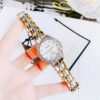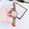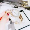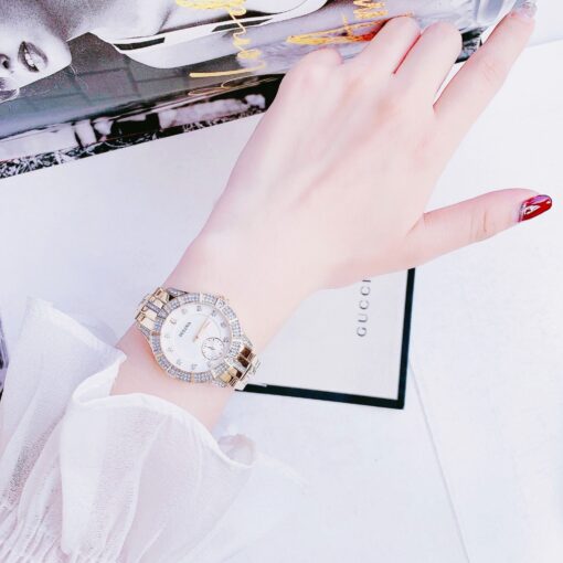 • Mặt khảm ngọc trai rực rỡ sắc màu được gắn 10 viên kim cương ở cọc giờ