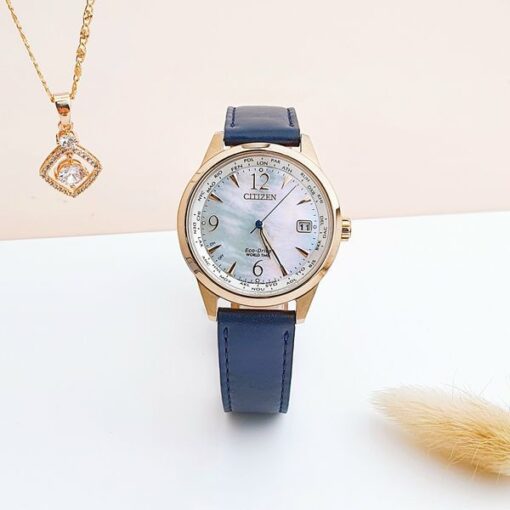 Citizen FC8003-06D Eco-Drive Ladies A-T World Time mặt khảm xà cừ, viền vàng hồng phối dây da xanh navy lên tay cực sang các nàng ạ!