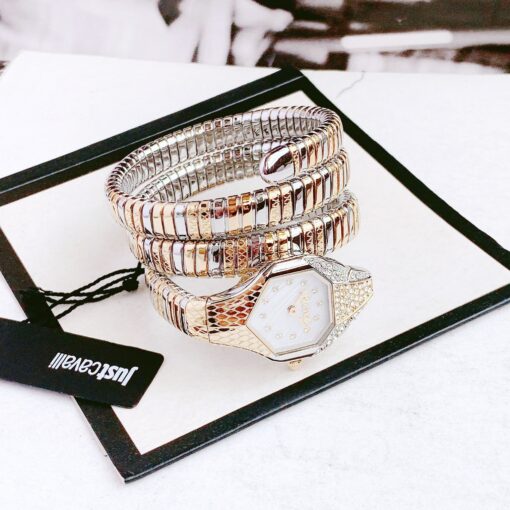 Tông demia trẻ trung, mặt sọc vân rắn sang chảnh kết hợp với mặt kính cong tạo khối siêu lạ mắt. Đầu rắn nạm đá, cọc số đính diamond