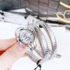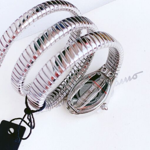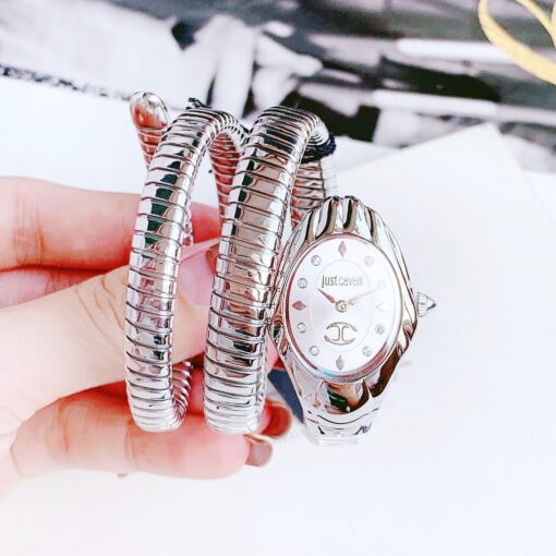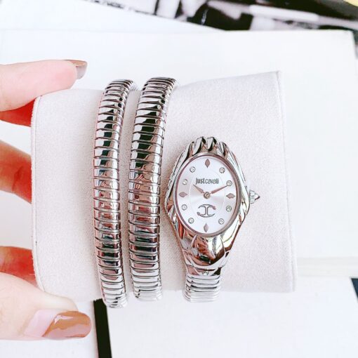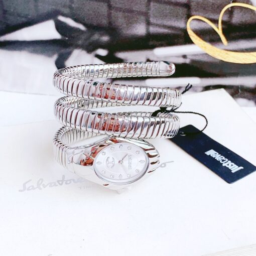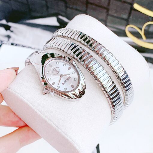 Tông bạc trẻ trung, mặt sọc vân rắn sang chảnh kết hợp với mặt kính cong tạo khối siêu lạ mắt. Đầu rắn nạm đá, cọc số đính diamond