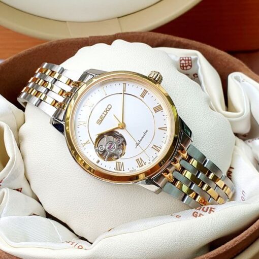 Với thiết kế open heart truyền thống của dòng presage cùng ô lộ cơ lớn ở góc 9h, các cọc số la mã thanh mảnh và kim chỉ giờ màu gold nổi bật trên nền mặt trắng tạo nên vẻ đẹp quyến rũ cho người đeo.