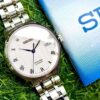 Bắt mắt với dial trắng vân lá lúa tuyệt đẹp và thường chỉ thấy ở những model đời cao 6R của Seiko, bộ kim xanh kết hợp với cọc số la mã cổ điển.